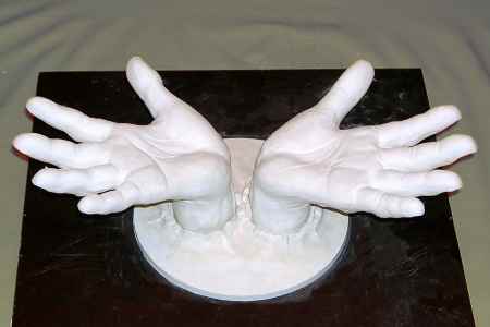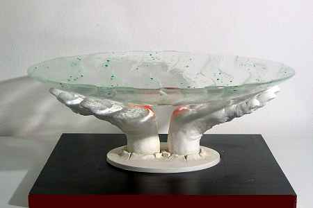 | Gipsmodell für einen Bronzesockel in Form zweier Hände, die eine Fläche durchstoßen um eine Glasschale zu halten (hier auf eine Holzplatte montiert). Unten das Modell mit der Schale, die in Fusingtechnik realisiert wurde. Durchmesser ca. 50 cm. Entstanden 2004. |